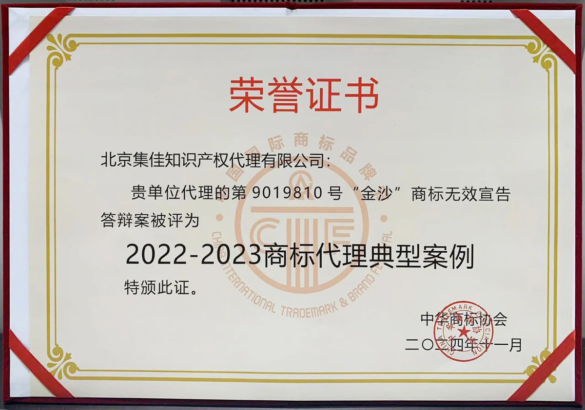 >龙珠直播>关于我们>荣誉概览>2024>集佳代理的“金沙”商标权无效宣告答辩案入选“2022-2023商标代理典型案例”