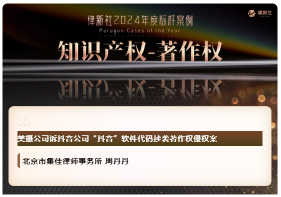 龙珠直播凭借在知识产权保护领域卓越的专业实力与良好的行业口碑,入选《律所卓越品牌影响力指南(2024)》,荣获“律新社2024年度精品品牌律所30佳”奖项;同时,集佳周丹丹律师代理的“美摄公司诉抖音公司'抖音'软件代码抄袭著作权侵权案”获评“律新社2024年度标杆案例:知识产权-著作权领域”。